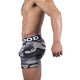 A classic stretch cotton gray camouflage boxer brief with a black waistband detailing a white signature Greatwood jacquard logo. Made in Los Angeles.