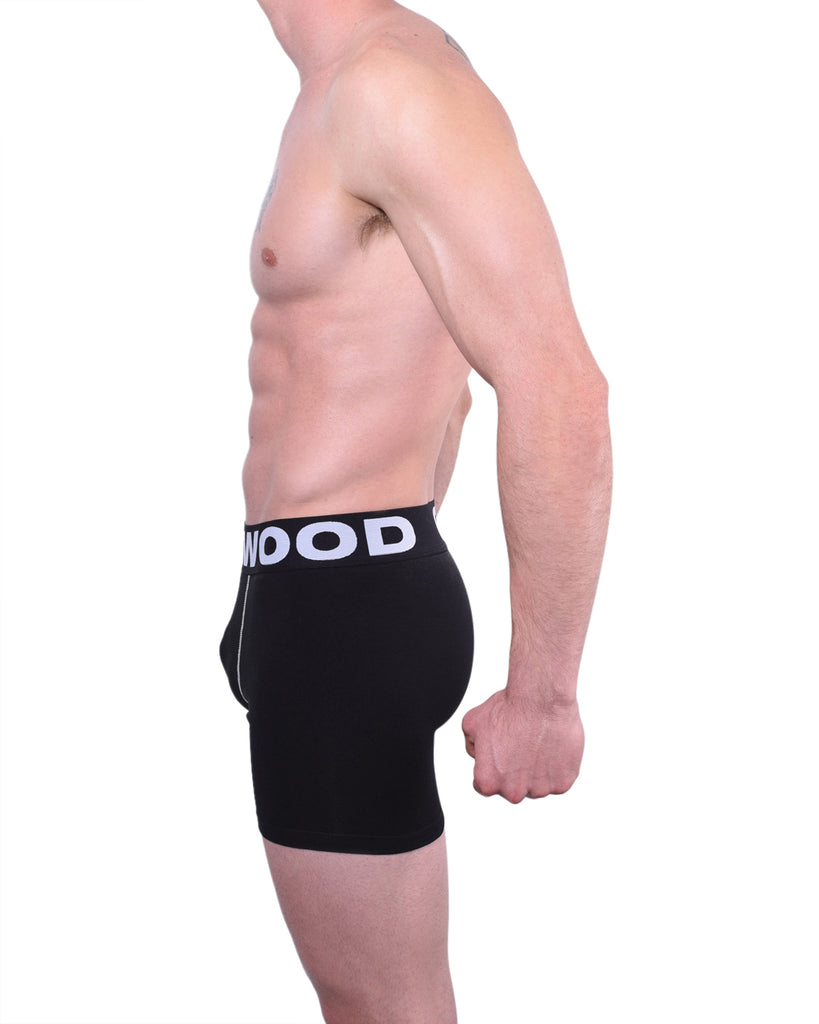 A classic stretch cotton black boxer briefs with a black waistband detailing a white signature Greatwood jacquard logo. The "Thai" also has an inside contrast with our signature orange modal fabric that's anti-odor. Made in Los Angeles.